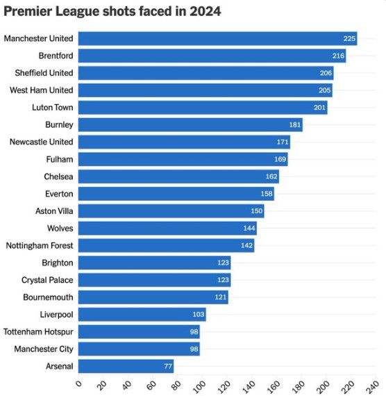 Pe lângă această înfrângere, statistica defensivă pe 2024 arată că United se confruntă cu o problemă majoră în ceea ce privește apărarea. Echipa a suportat un număr alarmant de 225 de șuturi asupra porții lor, mai mult decât orice altă echipă din Premier League în acest an, inclusiv mai multe decât rivalii direcți Arsenal și Manchester City combinați. Această vulnerabilitate defensivă a dus la un număr mare de goluri așteptate împotriva lor, depășind chiar și performanța defensivă a Arsenalului pentru întregul sezon.